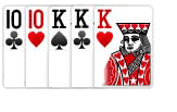 ROYAL FLUSH : kombinasi kartu ini adalah tingkatan tertinggi dalam permainan Poker, angka pada kartu harus berurut dengan angka tinggi, yaitu 10 ♠ �C J ♠ �C Q ♠ �C K ♠ �C As ♠ dengan bunga yang sama (tidak boleh beda), contoh lain : 10 �C J �C Q �C K - As